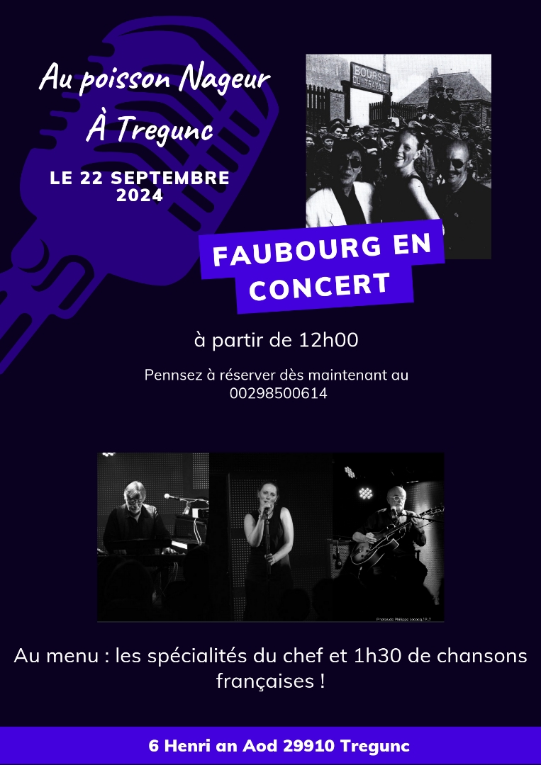 Concert de Trio Faubourg, Virginie Boscher au chant, Luc Paillard au clavier et Dany Piron à la guitare. Reprises de Boris Vian, Gainsbourg, Piaf, Barbara ou Brassens...sur la terrasse du poisson nageur à Saint philibert!!